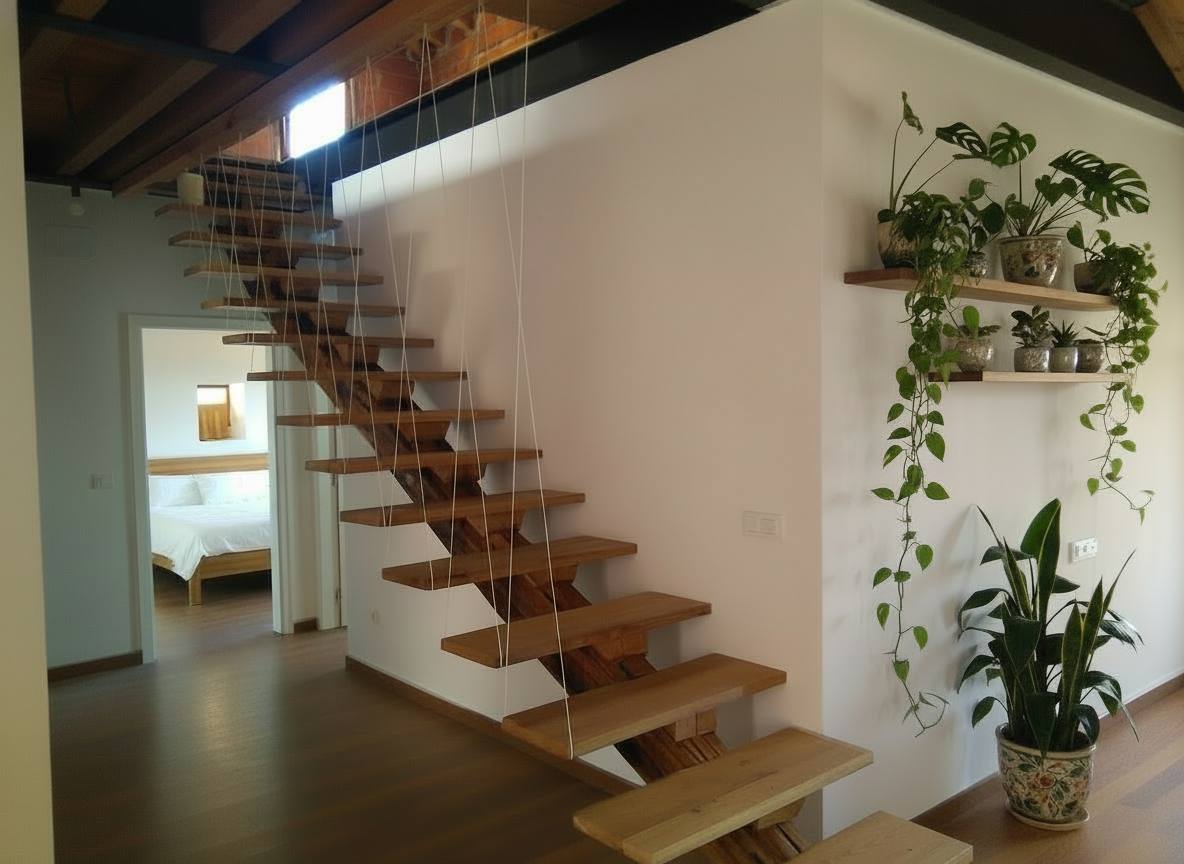 En el interior, a destacar la escalera, la cual se construyó con toda la madera de quercus (robur) que se pudo rescatar de las ruinas. Utilizando las vigas más alargadas como zancas ensambladas mediante unión tradicional de madera “rayo de Júpiter”, la cual funciona muy bien a tracción convirtiendo la propia flexión de la zanca. Y para las huellas utilizamos lo que pudimos aprovechar de las vigas restantes, cortándolos con cuidado y situándolos con calzas para conformar un bonita y artesanal escalera de quercus.